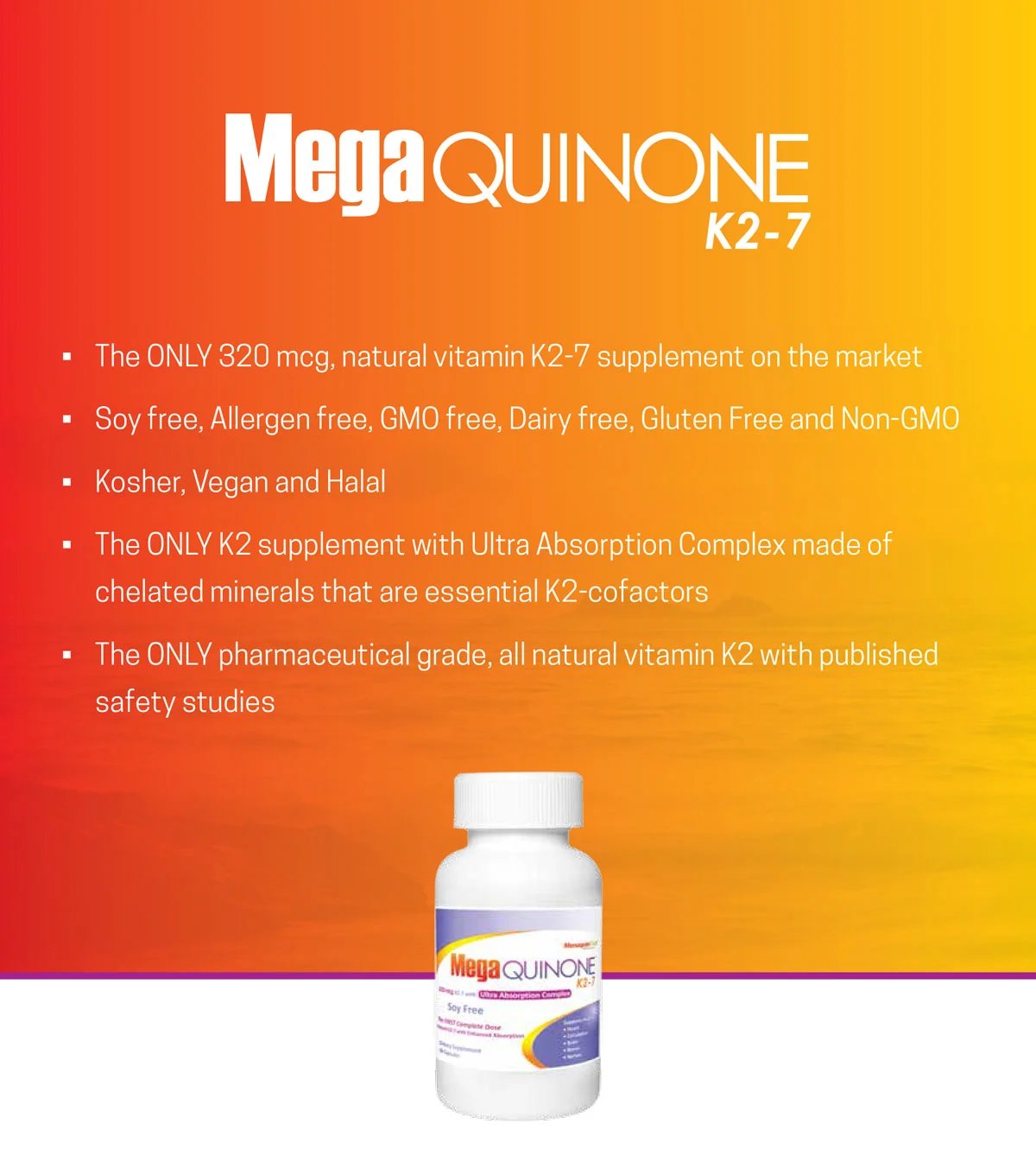 Given the fact that nearly everyone in the Western World is subclinically deficient in K2, as was described in a published study, this deficiency has a wide scope of influence on human health and the health and longevity of your patients. Supplementing with the optimum dose is paramount to rescue your patients from years of vitamin K2 deficiency and to reduce their risk of the most common chronic diseases. Supplementation with MegaQuinone, the highest potency vitamin K2 on the market, is an obvious choice!